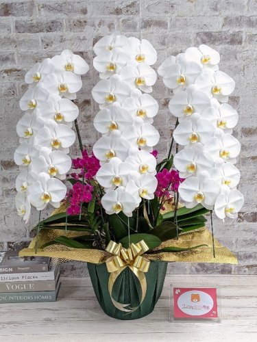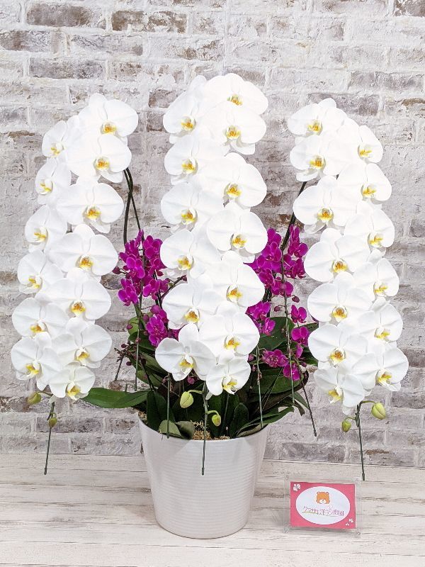 | 特徴 | 純白の大輪胡蝶蘭と濃いピンク色のミディ胡蝶蘭を組み合わせた寄せ植え。世界三大美女の楊貴妃のように決め細やかで繊細な美しさと、心に秘めた熱い情熱をイメージした胡蝶蘭。白と赤の胡蝶蘭が、強烈なコントラストを生み出し、それぞれの美しさをより引き立てます。 種類の違う胡蝶蘭の寄せ植えは市場に流通しないため、おそらく当農園でしか手に入らない胡蝶蘭です。ご注文が入ってから寄せ植えをつくるセミオーダーメイドの胡蝶蘭となります。 |